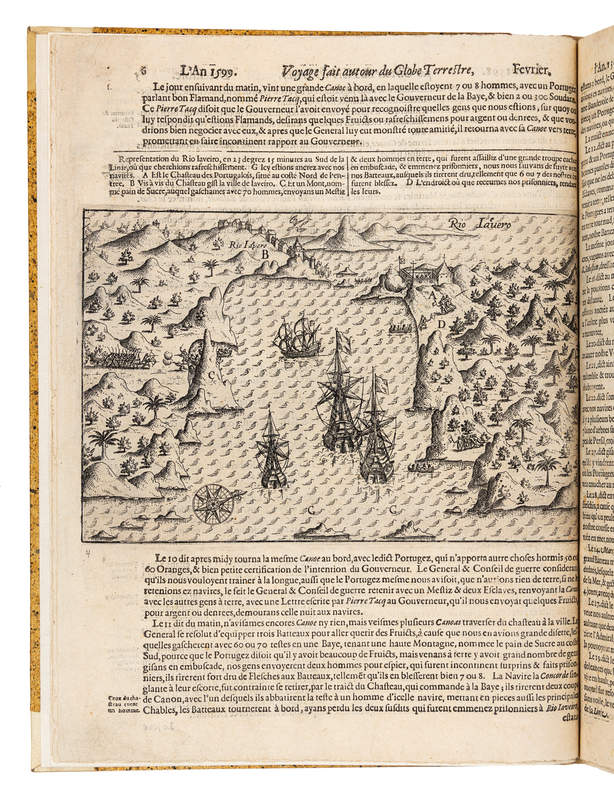 Folio (326 x 240 mm). Engraved vignette of the fleet ships on title-page, 25 engraved plates and maps (23 half-page, 2 full-page). (Title soiled, title and a few leaves with marginal restoration.) Modern half vellum. THE JOHN LANDWEHR COPY, OF VAN NOORT'S ACCOUNT OF THE FIRST DUTCH CIRCUMNAVIGATIONSecond French edition. Van Noort commanded fourth circumnavigation of the globe, after Magellan, Drake, and Cavendish. Throughout the voyage, nearly half the men mutinied, some 35 men were killed in skirmishes with the Fuegians, and another hundred died from disease. Van Noort arrived back in Holland "with only one battered ship and eight crew left (although some accounts suggest that forty-five crew survived). His voyage contributed little to the geographical knowledge of the time but had some effect in opening the way to the establishment of the Dutch in the East Indies...Van Noort's achievement, however, captured the imagination of his countrymen, and the published accounts sold well, the first appearing only eighteen days after his return. A more complete edition appeared later that year, followed by two amended editions in 1602" (Howgego). Alden & Landis 610/79; Borba de Moraes II:103; Howgego N37; Sabin 55438.