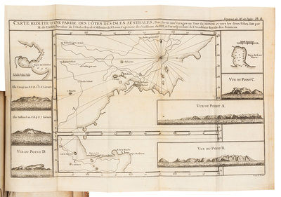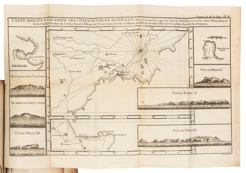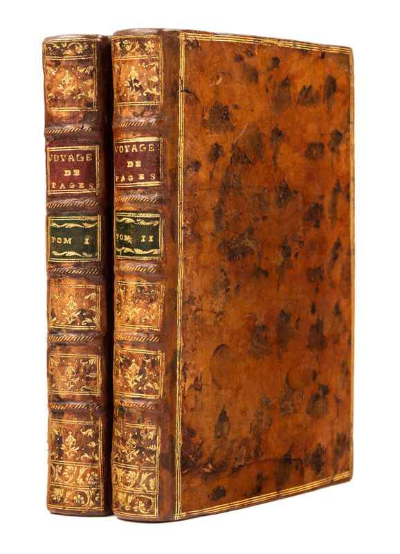 2 volumes, 8vo (194 x 122 mm). 7 engraved folding maps, 3 engraved folding plates. Contemporary French cat's-paw calf gilt, spines gilt, red and green morocco lettering-pieces gilt (discreet repairs to hinges and spine). Provenance: l'Abbe de la Cour (bookplate).FIRST EDITION of Pages' original account of his numerous voyages. In 1767, he explored the Louisiana Territory, traveling up the Mississippi and traversing Texas and Mexico by horse. He sailed with Kerguelen-Tremarac's unsuccessful second voyage in search of Terra Australis Incognita in 1773, and in 1776 he joined a Dutch whaling expedition. Hill p. 526 (English edition); Howes P-13; Sabin 58168; Spence 887.