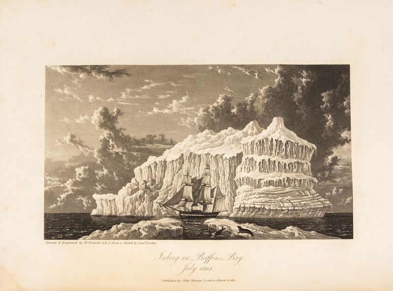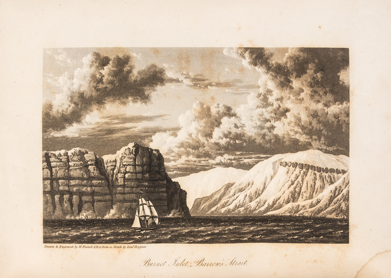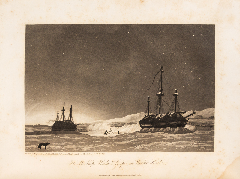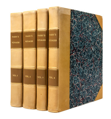 Journal of a Voyage for the Discovery of a North-West Passage from the Atlantic to the Pacific; Performed in the Years 1819-20, in His Majesty's Ships Hecla and Griper. London: William Clowes for John Murray, 1821. 6 engraved maps by J. Walker after John Bushnan et al., 2 folding, 9 aquatint plates by W. Westall after E.W. Beechey and H.P. Hoppner, and 5 etched plates by J. Clark after Beechey. Illustrations, diagrams, and letterpress tables in the text, one table folding. Errata slip tipped in after z1. Arctic Bibliography 13145; Brunet IV:387; Hill 1311; Lowndes p.1789; Sabin 58860 and 58861.Journal of a Second Voyage for the Discovery of a North-West Passage from the Atlantic to the Pacific; Performed in the Years 1821-22-23, in His Majesty's Ships Fury and Hecla. London: William Clowes for John Murray, 1824. Engraved frontispiece, 29 etched or aquatint plates (one plate trimmed close), all by E. Finden after G. Lyon, 4 engraved folding plates of coastal profiles by J. Walker after J. Bushnan, 9 engraved maps (4 folding) by J. Walker after J. Bushnan et al. Illustrations, diagrams, and letterpress tables in the text. Arctic Bibliography 13142 (including the 1825 "Appendix"); Brunet IV:388; Hill 1312; Lowndes p.1789; Sabin 58864 and 58865.Journal of a Third Voyage for the Discovery of a North-West Passage from the Atlantic to the Pacific; Performed in the Years 1824-25, in His Majesty's Ships Hecla and Fury. London: William Clowes for John Murray, 1826. Engraved frontispiece by E. Finden after H. N. Head, 5 engraved plates by E. Finden after H.P. Hoppner and H.N. Head, one engraved folding plate of coastal profiles by J. & C. Walker after H.N. Head, and 4 engraved maps by J. & C. Walker (one folding). Illustrations, diagrams, and letterpress tables in the text. Arctic Bibliography 13144 (erroneously calling for 8 plates); Brunet IV: 388; Hill 1313; Lowndes p.1789; Sabin 58867.Narrative of an Attempt to Reach the North Pole, in boats ... Attached to His Majesty's Ship Hecla. London: William Clowes for John Murray, 1828. Engraved frontispiece and 3 engraved plates by E. Finden and 3 engraved maps by J. & C. Walker (one folding and finished in color by hand, mounted on linen). Woodcut diagrams and letterpress tables in the text. Retaining "Directions to the Binder"/errata leaf. FIRST EDITION. Arctic Bibliography 13146; Brunet IV:388; Lowndes p. 1789; Sabin 58868.Together 4 works in 4 volumes, 4to (272 x 213 mm). (A few maps reinforced or repaired on verso, some light spotting or offsetting.) Uniformly bound in modern half calf. A COMPLETE SET OF FIRST EDITIONS OF PARRY'S THREE VOYAGES IN SEARCH OF THE NORTH-WEST PASSAGE TOGETHER WITH HIS FOURTH VOYAGE TO THE NORTH POLEAlthough Parry's three voyages in search of the Northwest Passage were unsuccessful, each advanced the knowledge of the area and resulted in new discoveries. "The immediate achievements of these voyages were the charting of hundreds of miles of coastline in the Canadian Arctic archipelago and the collecting of valuable data on Arctic natural history" (Hill). The expedition to the North Pole in 1827 sailed to Treurenburg Bay, Northern West Spitzbergen, and travelled over the ice in wheeled boats in their attempt to reach the Pole. They were frustrated by the conditions and the realization that the southwards drift of the ice was hindering their progress towards the Pole; nevertheless, they achieved 8245', which was the furthest North any human had travelled; their record stood for nearly fifty years.