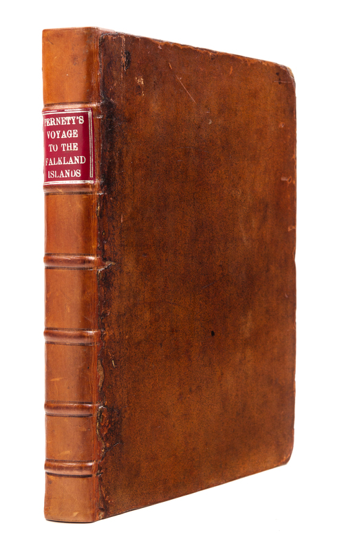 4to (264 x 203 mm). 7 engraved maps, charts and plans (4 folding), 9 engraved plates (3 folding). (Very minor offsetting.) Contemporary speckled calf (rebacked). Provenance:Robert Ballard Whitebrook (1917-2012), American historian and author (bookplate).FIRST EDITION IN ENGLISH of an important early source of information about the Falkland islands by Bougainville's personal secretary. Bougainville financed the expedition himself, intending to found a colony on the Falkland Islands; in doing so, he ignored Spanish claims that the islands were part of Patagonia, and he was perhaps unaware of John Strong's earlier landing there in 1690. The first settlement on the islands was made by Bougainville in January of 1764, when he landed provisions and men and built Fort St. Louis. The Falkland Islands sovereignty has been in dispute ever since.