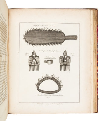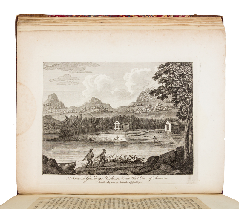 4to (297 x 240 mm). Engraved frontispiece portrait, large folding map of the Northwest Coast of America by J. Reid, 5 engraved folding maps, 13 engraved plates. (Minor pale offsetting to title and a few margins.) 19th-century tan half calf, marbled boards, uncut (board slightly scuffed). FIRST EDITION, A WIDE-MARGINED COPY. THE FIRST COMMERCIAL VOYAGE TO THE PACIFIC NORTHWEST. Portlock commanded the expedition for King George's Sound Company, chartered by the South Sea Company, for the purpose of fur trading. Portlock's depiction of the Indians and Russians he met during his journey helped "broaden the perspective" of Dixon's descriptions (Hill, see lot 57). Portlock, who took part in Cook's Third Voyage to the Pacific, also includes an account of Cook's death as described to him by a Hawaiian who witnessed it. Forbes 177; Hill 1376; Howes P-497; Lada-Mocarski 42; Sabin 64389; Wagner Northwest Coast 738.