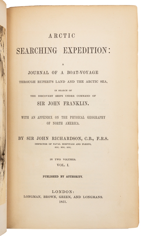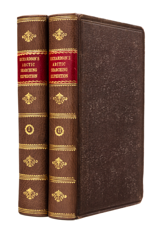 2 volumes, 8vo (220 x 140 mm). Color lithographed frontispieces in each volume, partially colored folding map (short tear at gutter), 10 color lithographed plates. (Pale dampstain to margin of frontispiece.) Publisher's gilt-stamped brown cloth (rebacked in morocco to match with red lettering-pieces gilt). FIRST EDITION. After Franklin's disappearance, Richardson, who had accompanied Franklin on two previous expeditions, considered it his duty to search for his friend. He and John Rae accompanied the party down the Mackenzie and along the Arctic coast to the Coppermine River and Fort Confidence. After crossing the Barren Lands to Great Bear Lake, where they wintered, Richardson realized the mission was too taxing; he returned to England and left the younger men to carry on. Richardson also shares observations about the flora and fauna of the region, including an appendix with a detailed listing of Canadian and Arctic plants. Arctic Bibliography 14489; Field 1300; Graff 3493; Sabin 71025; Stafleu & Cowan TL2 9170; Streeter VI:3716; Wagner-Camp 203:1.