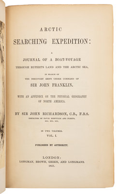 RICHARDSON, John (1787-1865). Arctic Searching Expedition: A Journal of a Boat-Voyage through Rupert's Land and the Arctic Sea, in Search of the Discovery Ships under the Command of Sir John Franklin. London: Longman, Green, Brown, 1851.