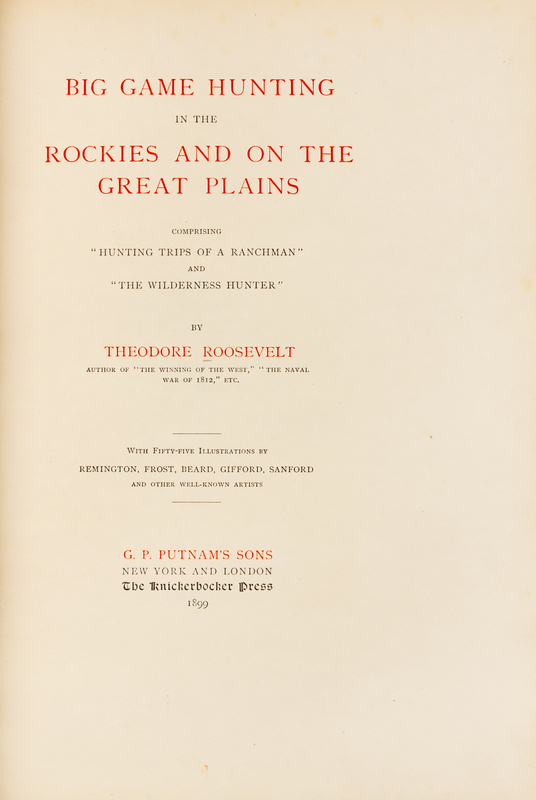 ROOSEVELT, Theodore (1858-1919). Big Game Hunting in the Rockies and on the Great Plains. New York: G.P. Putnam's sons 1899.