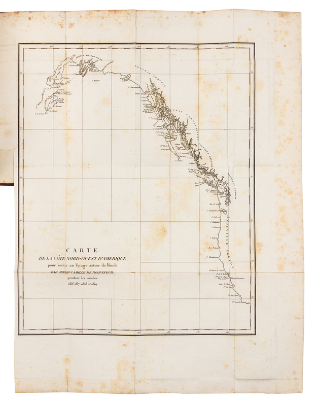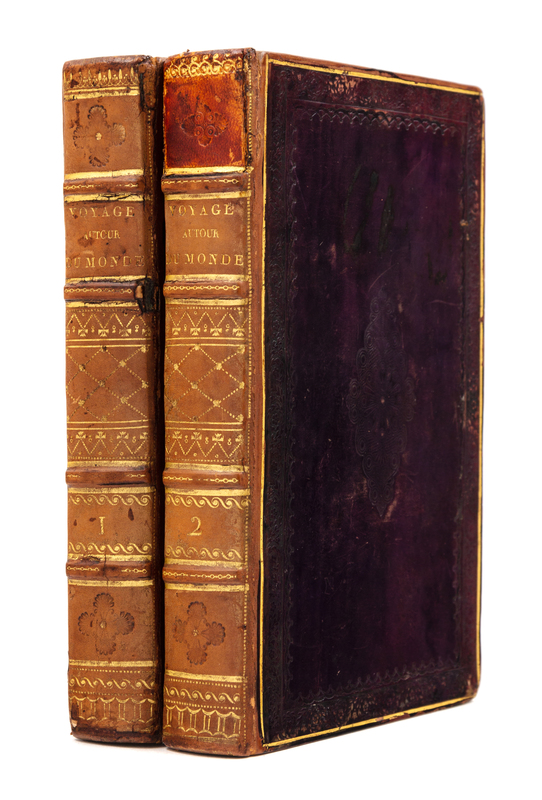 2 volumes, 8vo (201 x 131 mm). 2 engraved folding maps; half-titles. (Spotting to preliminary leaves, minor mostly marginal foxing.) Contemporary blind-panelled calf gilt (rebacked). Provenance: A. Gaidre? (signatures).FIRST EDITION of the only account of the third French circumnavigation of the globe, with an important account of the Pacific Northwest, Alaska, California, and Hawaii. "The ships Le Bordelais and Junior departed Bordeaux, France, October 19, 1816, sailed around Cape Horn, stopped at the Galapagos Islands, continued to the Northwest coast and Alaska, visited the Marquesas and the Hawaiian Islands after a second trip to the Northwest coast of America, then continued to Macao and around the world" (Forbes). "Attempts at trading in California, Nootka and Sitka were financial failures. Despite lack of profit however France now had an up-to-date report on conditions on the west coast of America from California to the Aleutians, on Hawaii, the Marquesas, and on the prospects for trade in each of these areas " (Hill). Cowan I p. 195; Forbes 569; see Hill 1483 (English edition); Howes R-438; Lada-Mocarski 86; Sabin 73149.