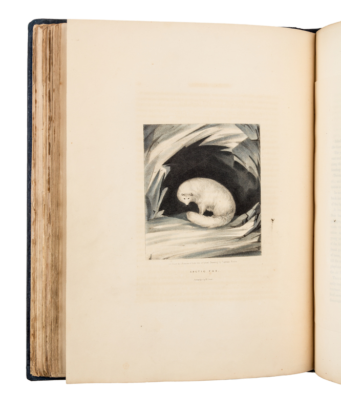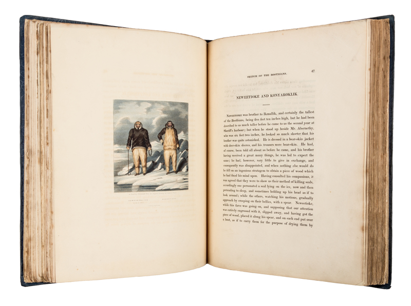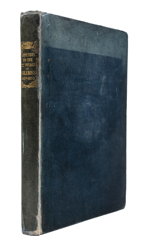 Volume II (Appendix) only, 8vo (319 x 245 mm). Engraved portrait, 19 engraved plates (12 hand-colored). (Some pale spotting at beginning and end, some minor marginal chipping to frontispiece and a few leaves at beginning.) Publisher's blue cloth, spine gilt (recased preserving original spine and endpapers, some sunfading or pale stains to covers).FIRST EDITION. Ross's privately funded second voyage in search of a North-West Passage necessitated publication of a substantial supplement, whose double-column list of the expedition's patrons, covering 36 pages, indicate the efforts Ross and others made to ensure the expedition's success. The expedition narrative was published earlier in the same year (see previous lot), leaving this supplement volume to detail the scientific and ethnographic findings of the expedition. The Appendix includes a detailed exposition on the Boothia Eskimos including a vocabulary, reports on chronometers, meteorology and magnetism, tables of Latitude and Longitude, Ross's theory on the Aurora Borealis, and James Clark Ross and John Richardson's reports on Naturaly history. Arctic Bibliography 14866.
