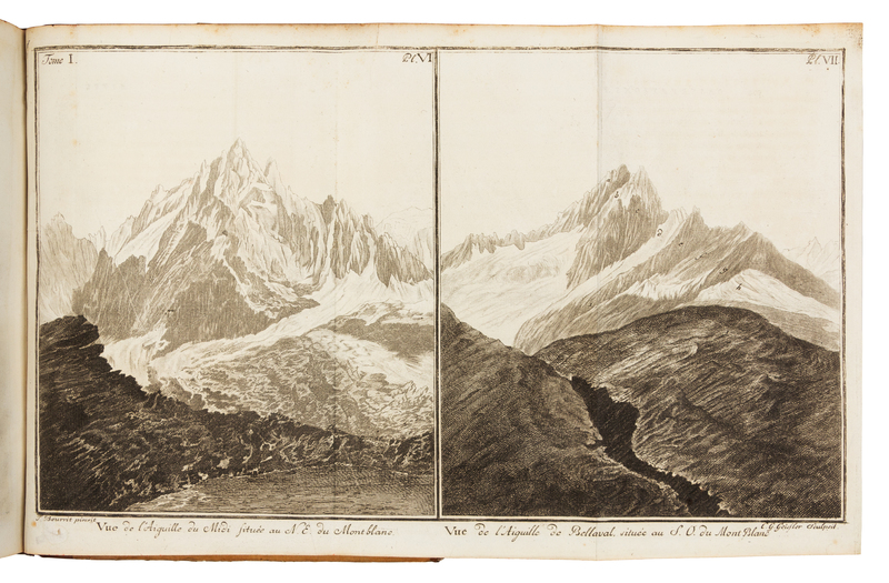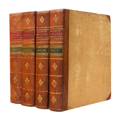 4 volumes, 4to (259 x 197 mm). 2 engraved folding maps, 2 folding tables, 22 engraved plates, numerous engraved vignettes. (Some slight pale marginal spotting.) Contemporary French half tan calf gilt, smooth spines gilt, red and green morocco lettering-pieces gilt (a few discreet spine repairs). FIRST EDITION, describing Saussure's forty years of alpine journeys and researches here grouped in three sections: his climbs through the Mont Blanc Massif, his journeys through the Mont Cenis Pass to the Italian and French peaks, and his numerous expeditions to the Valais, Piedmont and Savoy, St. Gotthard, and the Bernese Oberland. His studies of the geology and glaciology of the Alps were of great importance to the development of modern geology. He first climbed the glaciers of Chamonix at age 19 and, prior to his death at 59, crossed the Alps 14 times by 8 different routes. Saussure's work, according to Charles Mathews in Annals of Mont Blanc, is THE "FINEST OF ALPINE CLASSICS." Brunet V:150