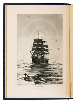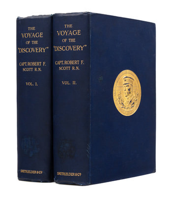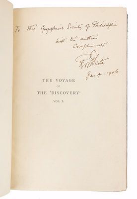 2 volumes, royal 8vo (237 x 160 mm). Photogravure frontispieces, 12 color-printed plates, 5 maps (2 folding in rear pocket), numerous photographic illustrations. Publisher's dark blue cloth gilt. Provenance: Geographical Society of Philadelphia (presentation inscription from Scott).FIRST EDITION, second issue, PRESENTATION COPY, INSCRIBED BY SCOTT on half-title in volume I: "To The Geographical Society of Philadelphia with the Author's Compliments. R.F. Scott. Jan. 4 1906." The British National Antarctic Expedition, 1901-1904, led by Scott who was accompanied by Shackleton and Edward Wilson aboard the Discovery, made the first extensive exploration of the interior of Antarctica. The party reached the furthest south latitude of 82, and examined the coast of Victoria Land and the Ross Ice Shelf. Scott's team made the first balloon ascent on the continent, rising some 700 feet to take the first aerial photograph of the Antarctic. The party returned home in February 1904; by November, an exhibition of the expedition opened at Bruton Galleries, and Scott presented his first lecture about the expedition. He was awarded the Patron's Gold Medal of the Royal Geographical Society, among numerous other awards, including a medal from the Geographical Society of Philadelphia. A VERY FINE ASSOCIATION COPY.