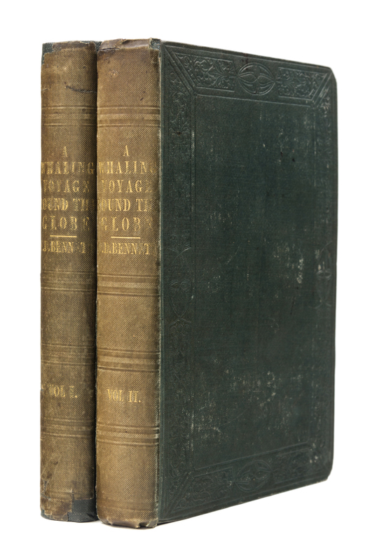 2 volumes, 8vo (223 x 137 mm). Engraved folding map, 2 aquatint frontispieces, in-text engravings; 2 pp. advertisements. (Some mostly marginal spotting.) Publisher's green cloth gilt (Vol. I rebacked preserving original spine, Vol. II lower joints splitting with small repair at head of spine, lightly worn).FIRST EDITION of one of the best books on the whale fishery according to Herman Melville, by the expedition scientist aboard the ship Tuscan. He details the anatomy and habits of whales and the best way of conducting the industry. In the course of the voyage Bennett called at Pitcairn Island and gives an account of the Bounty mutineers, Tahiti, the Marquesas and Hawaii. "He was specifically assigned to observe the anatomy and habits of southern whales, to determine the best way of conducting the sperm whale fishery industry, to investigate the islands of Polynesia, and to collect samples of natural history" (Hill). Hill 113; Sabin 4726; Spence 122.