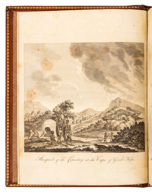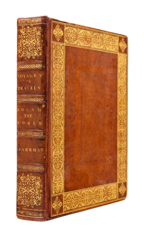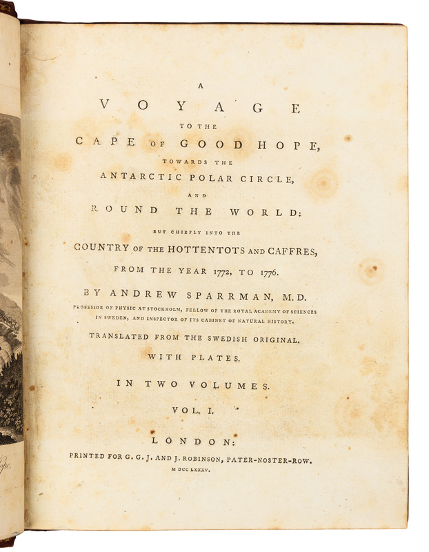 2 volumes in one, 4to (262 x 202 mm). Engraved folding map, 10 engraved plates. (Some scattered minor foxing to text and plates.) Contemporary calf, marbled edges (expertly rebacked preserving original spine and endpapers). Provenance: Abraham Wildey Roberts (bookplate). FIRST EDITION IN ENGLISH OF SPARRMAN'S ACCOUNT OF COOK'S SECOND VOYAGE, including Sparrman's account of his travels inland from the expedition's settlement at the Cape of Good Hope. He includes a number of details not present in other accounts of the voyage, and much of his narrative relates to his time in South Africa. "The author relates many incidents illustrating the hospitality of the Dutch farmers and their dense ignorance of matters outside their own country, and he makes allusions to the cruelty of the treatment of the slaves by the lower classes of the colonists. He frequently draws attention to the inaccuracies to be met with in [Peter] Kolbe[n]'s account of the Cape, and throws considerable doubt on the veracity of many of his statements." (Mendelssohn). Conrad p.14; Hill, p.279; Mendelssohn II:414; Renard 1516; Rosove 316.A1 ("Scarce"); Spence 1146.