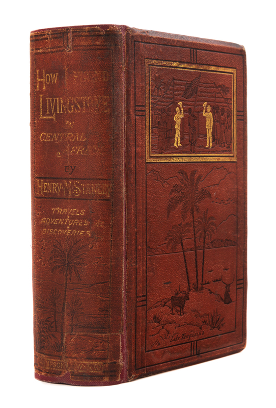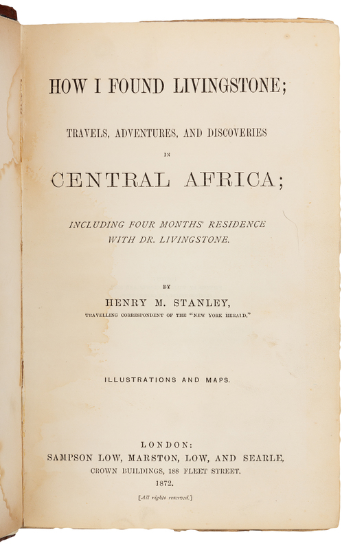 8vo (220 x 139 mm). 8pp. publisher's advertisements. Photographic frontispiece portrait mounted, 5 maps (4 folding) (one map reinforced on verso at gutter), 28 engraved plates. (Frontispiece and preliminaries dampstained at gutter.) Publisher's pictorial brown cloth blocked in gilt and black (recased with new endpapers).FIRST EDITION, "ONE OF THE MOST FAMOUS BOOKS IN THE BROAD SPECTRUM OF AFRICAN EXPLORATION" (Czech). In 1869, Stanley set out to find Livingstone at the urging of James Gordon Bennett, Jr., publisher of the New York Herald, who had sponsored his first trip to Africa in 1867. He located the Scottish explorer at Ujiji, on the shores of Lake Tanganyika, in November 1871. Czech p.152; Mendelssohn IV:379.