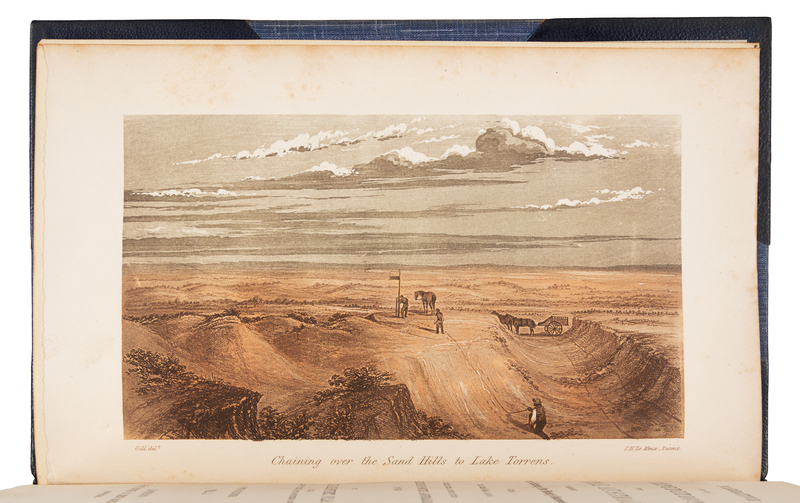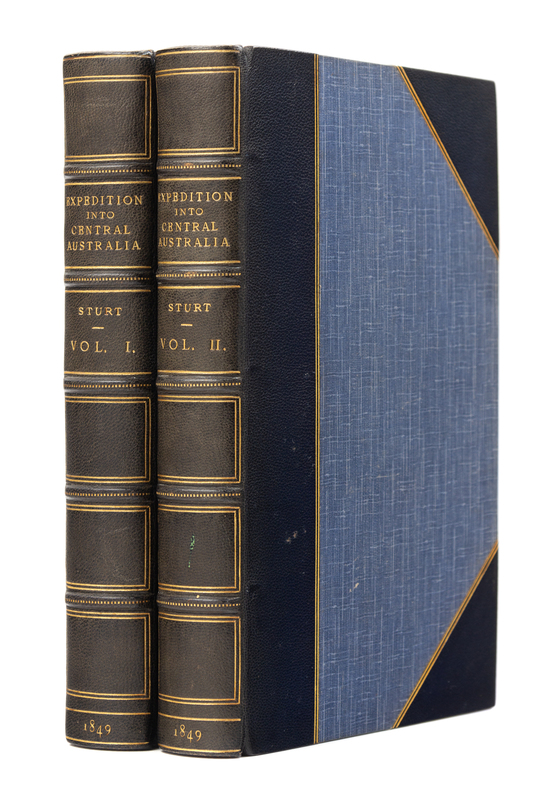 2 volumes, 8vo (219 x 137 mm). Folding map (mounted on linen), 16 engraved plates (6 hand-colored). Later half morocco, by Morrell. FIRST EDITION. "The geographical results of Sturt's last expedition, the first into the heart of the continent, were significant. He determined the confluence of the Darling and the Murray, settled speculation about a vast inland sea, found no evidence of a large central river, and determined that there was no central dividing range. The expedition was also responsible for major discoveries, especially the discovery and exploration of Cooper's Creek, the Stony Desert, and Simpson Desert. For his labours in the cause of Australian discovery Sturt was awarded the gold medal of the Royal Geographical Society in 1847 and hailed as a national hero" (Wantrup). Ferguson 5202 (noting the map); Wantrup 119.