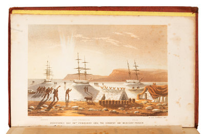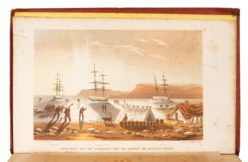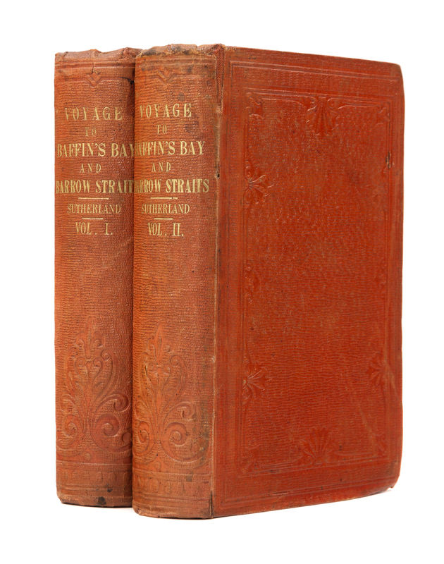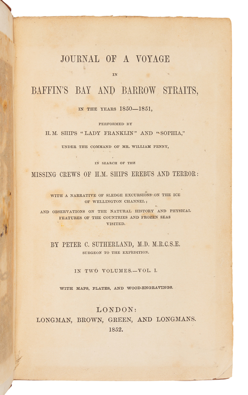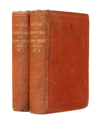 2 volumes, 8vo (196 x 120 mm). 2 chromolithographed folding maps (one with tape repairs on verso with associated stain showing through), 6 plates (4 printed in color); 2 pp. publisher's advertisements at the back of vol. 1 dated June 12, 1852. . Publisher's ochre cloth decorated in gilt and blind (a few small stains and repairs to spines). FIRST EDITION. In 1850, fourteen ships were searching the Arctic for Sir John Franklin's missing crew and ships; earlier that year, the Admiralty had offered a prize of 20,000 for Franklin's rescue, 10,000 for finding his ships and the same amount for the first crossing of the North-West Passage. Penny was commander of the Lady Franklin and the Sophia, and the latter was captained by Alexander Stewart with Sutherland as surgeon to the expedition. The officers and majority of the crew were experienced Arctic whalers or sailors, and Sutherland served on two previous whaling voyages with Penny. Arctic Bibliography17231; Sabin 93963.
