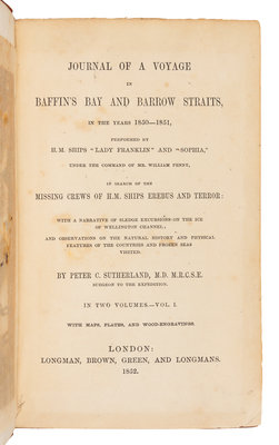 SUTHERLAND, Peter Cormack (1822-1920). Journal of a Voyage in Baffin's Bay and Barrow Straits, in the years 1850-1851, performed in H.M. Ships 'Lady Franklin' and 'Sophia,' under the command of Mr. William Penny, in search of the Missing Crews of H.M. Ships Erebus and Terror. London: Longman, Brown, et al, 1852.