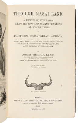 THOMSON, Joseph (1859-1895). Through Masai Land: A Journey of Exploration Among the Snowclad Mountains and Strange Tribes of Eastern Equatorial Africa. London: Sampson Low, et al, 1885.