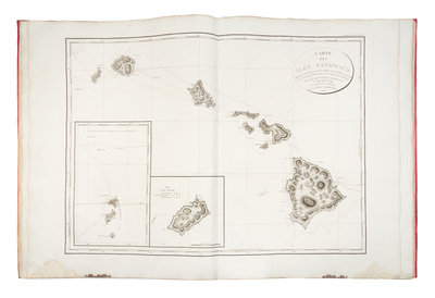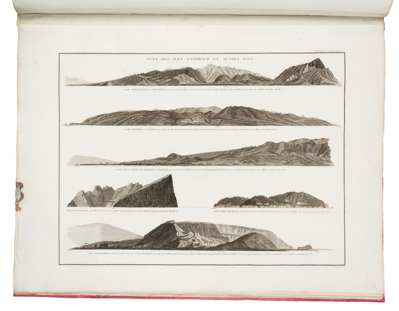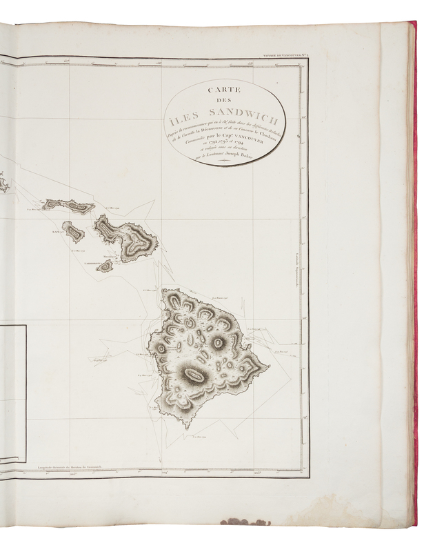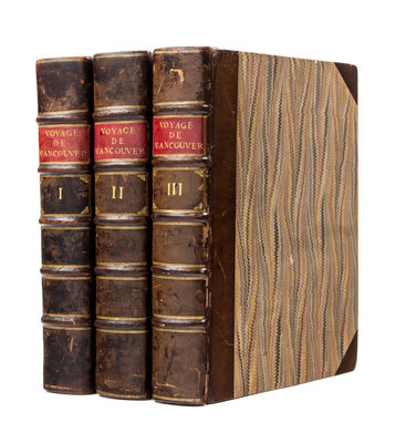 4 volumes, comprising: text, 3 volumes, 4to (310 x 227 mm); atlas, folio (650 x 475 mm). Text: Half-titles, 18 engraved plates; atlas: 16 engraved maps and profiles (10 double-page). (Dampstaining and minor staining to atlas.) Text: Modern half calf antique, uncut, largely unopened, publisher's blue paper wrappers bound in (some scuffs and minor discoloration); atlas: Contemporary boards (rebacked and recovered to style). Provenance: Jules Remy (signature in atlas); P. G. Skinos (bookplate).FIRST EDITION IN FRENCH OF ONE OF THE MOST DIFFICULT GEOGRAPHICAL SURVEYS. "This voyage became one of the most important ever made in the interests of geographical knowledge" (Hill). After serving on Cook's second and third voyages, Vancouver was made commander of a grand-scale expedition to establish Britain's territorial rights in the Pacific North West following the Nootka Convention at Nootka Sound, Vancouver Island in 1790. His orders were also to examine thoroughly the coast south of 60 in order to find a possible passage to the Atlantic. Over the course of three seasons, he surveyed the coast of California (visiting San Francisco and San Diego), met with the Spanish at Nootka, discovered the Strait of Georgia, circumnavigated Vancouver island, and proved that no passage existed between the Pacific and Hudson's Bay. He died in 1798, and his narrative was completed by his brother and by Peter Puget. Hill notes that Vancouver undertook his surveys "with a thoroughness rarely equalled in the history of maritime exploration...completing the most arduous survey that it had fallen any navigator to undertake." Ferguson 320b; see Hill 1753 (English edition); Lada-Mocarski 55; Sabin 98441.
