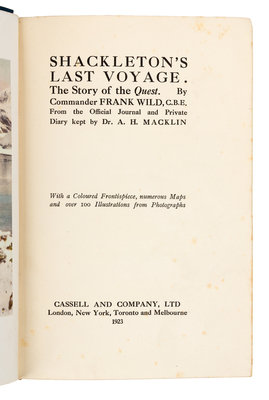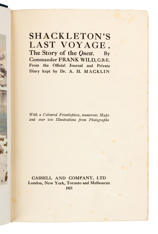 WILD, Frank (1873-1939). Shackleton's Last Voyage. The Story of the 'Quest'. From the Official Journal and Private Diary kept by Dr. A. H. Macklin. London: Cassell and Co., 1923.