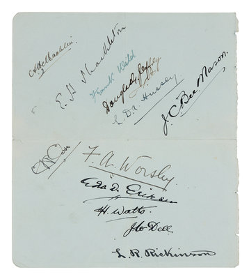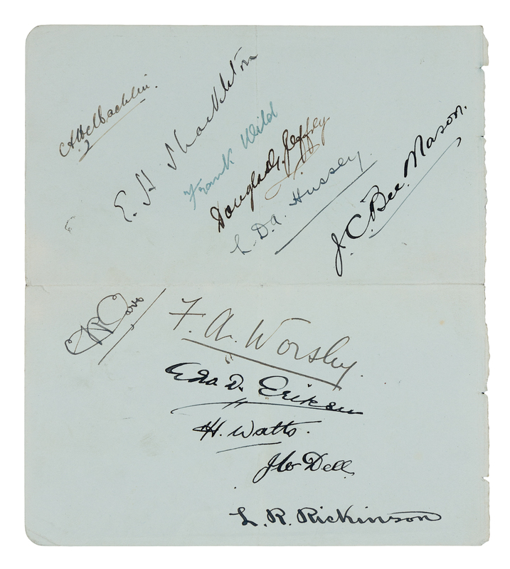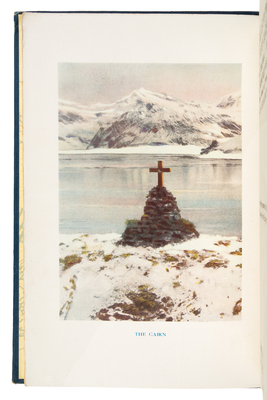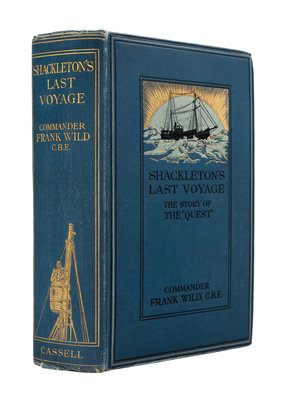 8vo (231 x 157 mm). Color-printed frontispiece, 100 photographic plates. Publisher's decorated blue cloth (slight wear at spine ends and corners, edges with slight spotting, hinges tender). Provenance: Owner's gift inscription on front free endpaper.FIRST EDITION, an account of the Shackleton-Rowett Expedition to the Antarctic from 1929-1923, and also a personal memorial from Wild and others to Shackleton, who died aboard the Quest in January 1922 while anchored at Grytviken, South Georgia Island. Wild took command and carried out the original expedition plans, including making surveys of in the Weddell Sea, and of Elephant Island, Deception Island, South Georgia, and the South Sandwich Islands. Conrad, p. 232; Rosove 349; Spence 1259.[Laid in:] Single sheet (removed from a notebook or autograph book) with signatures in ink of 12 members of the Quest expedition, including Shackleton, Wild, Worsley, and Macklin.