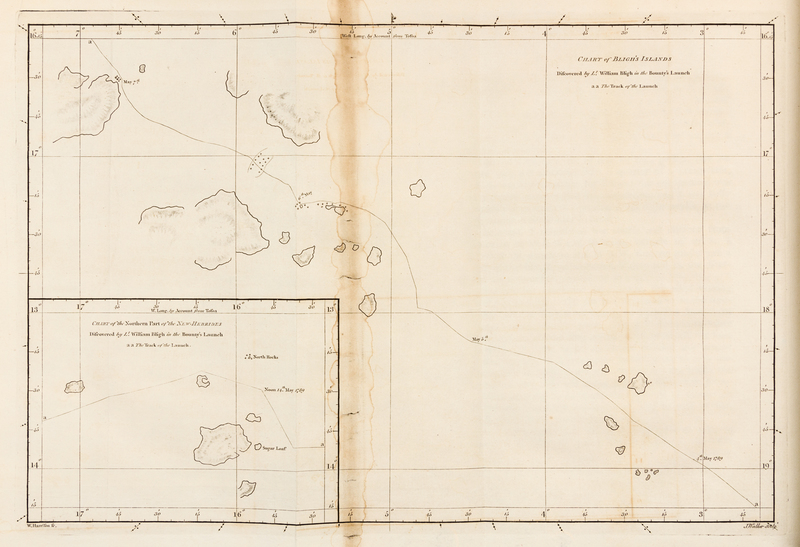 4to (270 x 221 mm). Engraved frontispiece portrait, 3 engraved plates (2 folding), 4 engraved maps and charts 3 folding). (Some minor offsetting or browning.) Contemporary sheep-backed boards (spine skinned and restored preserving original backstrip and label, boards rubbed); blue slipcase.FIRST EDITION OF "ONE OF THE MOST REMARKABLE INCIDENTS IN THE WHOLE OF MARITIME HISTORY" (Hill). Following a request by West Indian merchants to George III, Sir Joseph Banks recommended that the Admiralty fit out the Bounty for a voyage to collect bread-fruit trees from Tahiti for shipment to the West Indies. Banks also recommended Lieutenant Bligh as commander of the voyage on which Fletcher Christian sailed as Master's Mate. Reaching Cape Horn in 1787 and encountering fierce head winds, Bligh retreated across the South Atlantic to round the Cape of Good Hope and sail south to Australia and New Zealand to Tahiti. This is the first official account of the voyage and mutiny, edited from Bligh's journals by James Burney under the supervision of Sir Joseph Banks while Bligh was on his second bread-fruit voyage. The year of publication also marked the court-martial proceedings against fourteen returned mutineers, three of whom were hanged. Ferguson 125; Hill 135; Kroepelien 93; NMM 1:624; Sabin 5910.