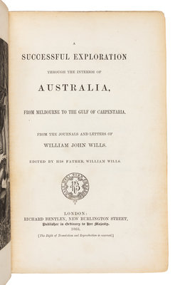 WILLS, William John (1834-1861). A Successful Exploration through the interior of Australia, from Melbourne to the Gulf of Carpentaria. From the Journals and Letters of William John Wills. London: Richard Bentley, 1863.