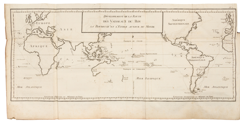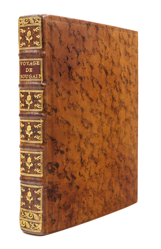 4to (250 x 194 mm). 3 engraved plates, 20 engraved folding maps (16 folding); half-title. Mottled calf antique preserving original marbled endpapers.FIRST EDITION of the account of the "first official French circumnavigation" (Hill). Bougainville, a highly regarded officer, served as aide to the Marquis de Montcalm in Canada and was a combatant at the fall of Quebec and later Montreal. He helped negotiate the Treaty of Paris "ceding most of France's North American colonies to the British" then attempted unsuccessfully to establish a French colony in the Falkland Islands. At the request of the King, he undertook the first French circumnavigation of the globe, departing Nantes in November 1766 and returning to St. Malo in March 1769 (a voyage also notable for carrying the first woman on a circumnavigation: the mistress of the ship's botanist, disguised as his valet). The important engraved maps depict the route of the circumnavigation by the two vessels, the Straits of Magellan, Tierra del Fuego, Tahiti, the Solomon Islands, the Celebes, Java, and other Pacific regions. See also lot 462. Hill 163; Sabin 6864.