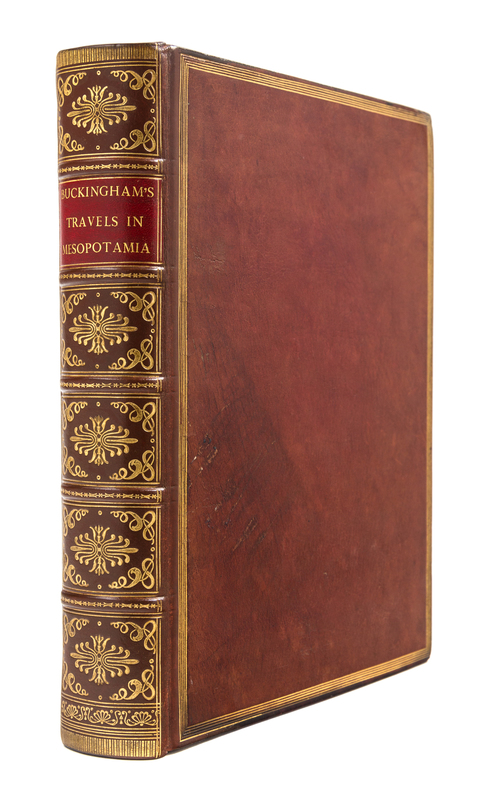 4to (274 x 207 mm). Engraved folding map, 2 lithographed folding plates, in-text woodcut vignette illustrations. (Lacking half-title, minor foxing on preliminaries.) Contemporary polished russia gilt (rebacked preserving original endpapers). Provenance: George Rentz (signature on title-page).FIRST EDITION of the account of Buckingham's travels through Asia Minor from Aleppo to Baghdad in 1816. "It is full of lively descriptions and sympathetic characters" (Blackmer). Allibone I, p. 277; Blackmer 233.