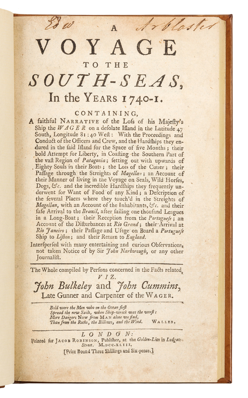 BULKELEY, John (fl. 1740) and John CUMMINS (fl. 1740). A Voyage to the South-Seas, in the Years 1740-1. Containing a faithful Narrative of the Loss of His Majesty's Ship the Wager on a desolate IslandWith the Proceedings and Conduct of the Officers and CrewThe Whole compiled by Persons concerned in the Facts related viz. John Bulkeley and John Cummins, Late Gunner and Carpenter of the Wager. London: for Jacob Robinson, 1743.