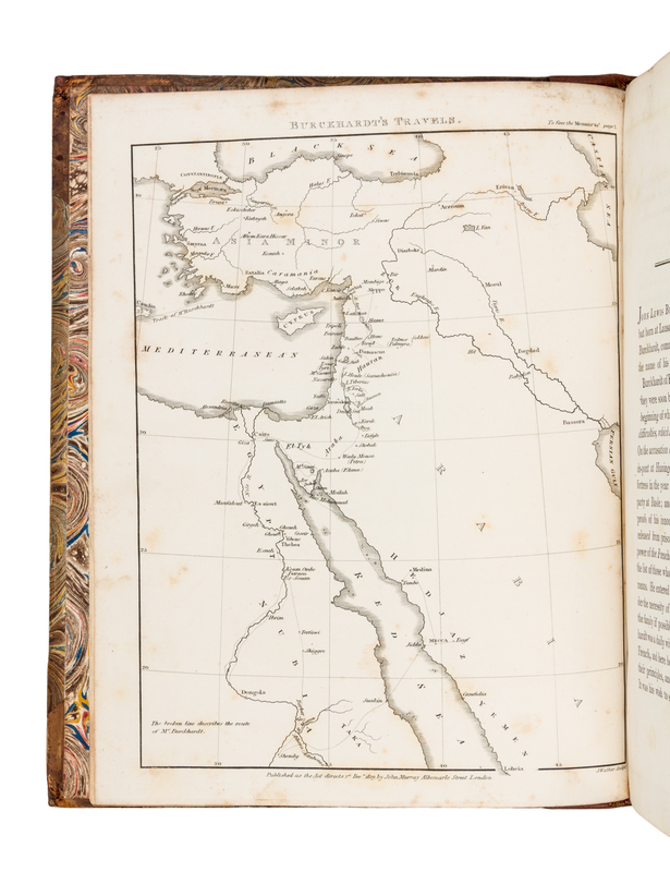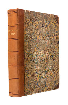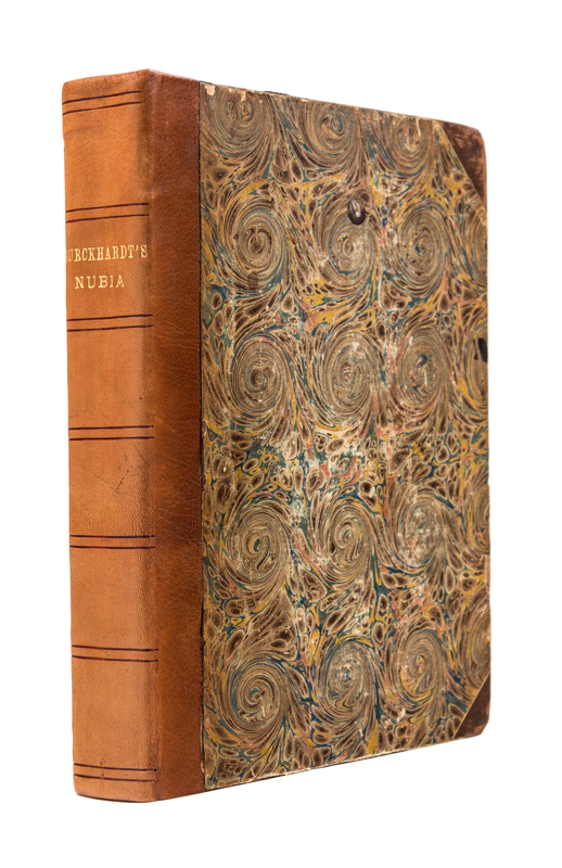 4to (267 x 209 mm). Engraved frontispiece portrait, 3 engraved maps (2 folding). (Slight spotting to portrait and maps.) Half calf, contemporary marbled boards (modern tan calf rebacking). Provenance: William Oliver Rutherfurd, Edgerston (bookplate); David Graham (bookplate).FIRST EDITION of Burckhardt's posthumously published journals of his journey down the Nile and across the Nubian desert, a "balanced, objective and often sympathetic account of the Arab world" (Hamilton). Burckhardt "left Aleppo in 1812 and made his way to Cairo; he then carried out two journeys: one along the upper Nile and the other through the Nubian desert. These travels were edited from Burckhardt's journals by Leake; he also wrote the biographical memoir which is prefaced to the travels" (Blackmer). See Blackmer 238 (second edition); see Hamilton, Europe and the Arab World 57; Howgego II, B76.