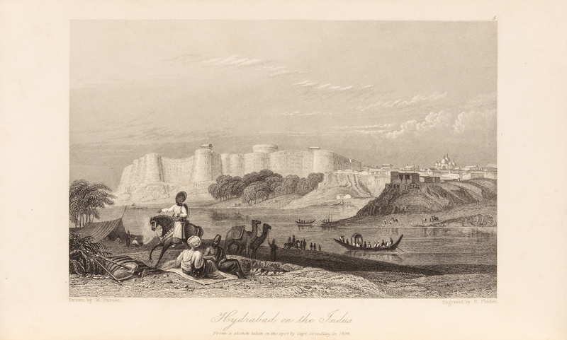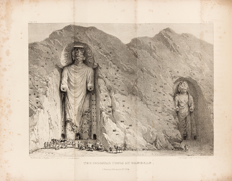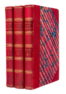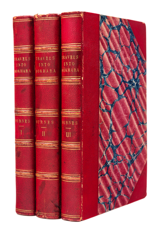 3 volumes, 8vo (214 x 136 mm). 3 lithographed plates (1 folding), 5 engraved plates. (Some light spotting to plates.) Late 19th-century half red morocco, marbled boards.FIRST EDITION. Following a successful expedition up the Indus at the age of 26, Burnes obtained permission for an expedition to Kabul and Bokhara. In 1832 he travelled to Kabul, ruled by Dost Mohammed, and passed over the Hindu Kush to Balkh, where he found the graves of Trebeck, Moorcroft and Guthrie. By way of the Oxus, and the desert crossing he finally reached Bokhara where he received a welcome from the vizier Koosh Begee. After one month there he returned by way of Merv, to the Persian Gulf and finally Bombay. He received a hero's welcome when sent to London to report on his findings, and received an audience with the King. ''John Murray... was quick to acquire Burnes's account of his journey... It was rushed through the press so as to steal a march on Arthur Conolly's book, which appeared a few months later, and Moorcroft's long-delayed posthumous work... [It] brought to the reader for the first time the romance, mystery and excitement of Central Asia. It was to prove an immediate bestseller, 900 copies being sold on the first day.'' (, p.151). His book caused a sensation in Europe and won him the R. G. S. Gold Medal, after which he became universally known as "Bokhara Burnes." Yakushi B302.