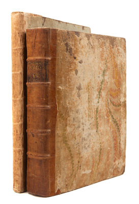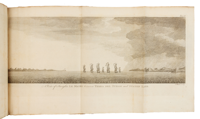 One volume bound in 2 (not uniform), comprising: text 4to (270 x 212 mm); atlas: large 4to (297 x 243 mm). Atlas: 43 engraved folding plates (including a duplicate of plate 12). (Very minor pale spotting.) Text: sheep-backed marbled boards gilt, uncut (very slightly rubbed); Atlas: original paper-backed boards, uncut; both volumes housed in a half tan calf folding case.FIRST EDITION of the official account of one of the landmark 18th-century circumnavigations, rare issue with the plates bound separately at a contemporary date. "This compilation has long occupied a distinguished position as a masterpiece of descriptive travel. Anson's voyage appears to have been the most popular book of maritime adventure of the eighteenth century" (Hill). Bibliographies call for 42 maps and plates, but this copy has 43 including the general route map in the text volumes. Both the National Maritime Museum copy and the Hill copy have 17 preliminary pages, whereas this copy has 33 pages to include the List of Subscribers. Borba de Moraes, p. 38; Cox Vol. I, p. 49; ESTC T89475; Hill, pp. 317-18; Sabin 1625.