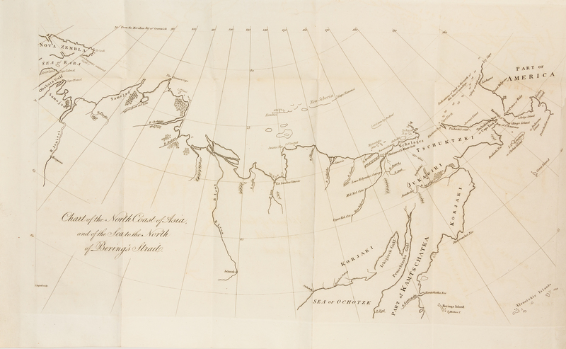 8vo (227 x 138 mm). 2 engraved folding maps. Original boards uncut (spine repaired with some chipping to joints and label).FIRST EDITION IN ORIGINAL BOARDS of the important companion volume to Burney's Chronological History of the Discoveries in the South Sea (1803-17). It includes Burney's eyewitness account of Cook's third voyage (see lot 48). Burney sailed as Rear Admiral aboard the Resolution and lieutenant on the Discovery before being transferred to the Resolution on Clerke's death. This volume contains an intimate account of Cook's third voyage, including a moving first person account of Cook's death. The two maps are of the north coast of Asia and Barents Sea. Forbes 491; Hill 223; Holmes 82; Howes B-1001; Mitchell Cook 1657-8; Sabin 9386; Streeter sale 3510; Strathern 80.