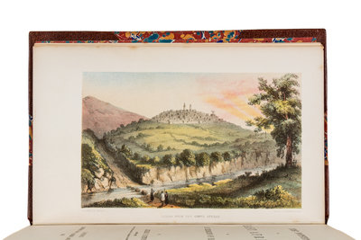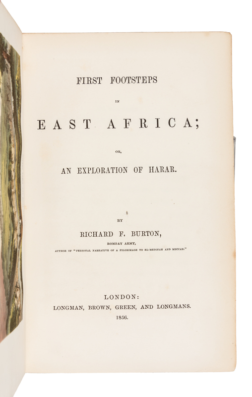 8vo (216 x 137 mm). Two maps, 4 colored lithographic plates; half-title. (A few pale stains primarily to outer margin.) Modern half brown morocco gilt, marbled boards. FIRST EDITION, second issue, without the suppressed fourth appendix included in the first issue. In 1849, the East India Company supported an exploration program to present-day Somalia. By 1854, the program was largely abandoned, but was revived by Burton to become his first African expedition. That year, he set out from Aden disguised as an Arab merchant to cross the desert to Harar, a closed city never opened to foreigners. Speke accompanied him on the journey, and their differing accounts of the true source of the Nile River ignited a controversy between the two. Appendicies include Speke's diary of his African journey, Hearne's meterological observations, and a description of Cornwallis's 1841 attempt to enter Harrar. Penzer p. 60-63; Casada 35; Spink 16.