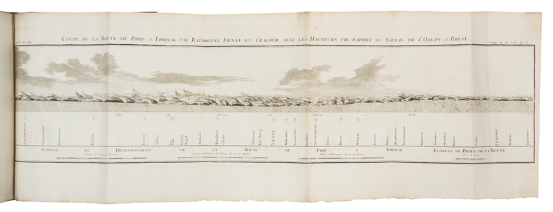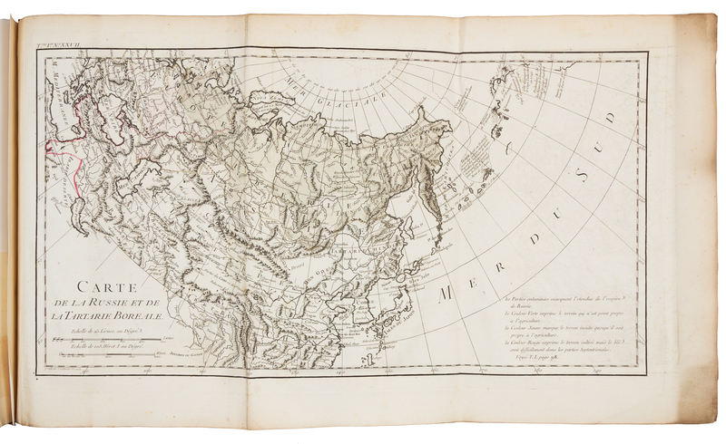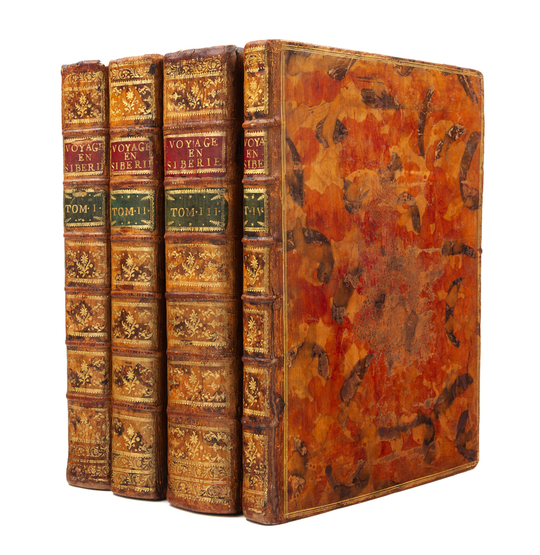 4 volumes, comprising: 2 text volumes in 3 and atlas, 4to (335 x 249 mm). Text: engraved frontispiece by J.B. Tilliard after J.B. le Prince, 54 engraved plates and plans (4 folding) by J.P. le Bas, J.B. Tilliard, A. de St. Aubin, C. Baquoy, et al after le Prince, C. de Fecamp, and J.M. Moreau, one engraved table, engraved vignette by Duclos after le Prince on title, woodcut vignettes on other titles, engraved head-piece and type-ornament head-pieces, woodcut tail-pieces, letterpress tables in the text, retaining errata and instructions to the binder leaves. Atlas: engraved frontispiece by J.B. Tilliard after J.B. le Prince, 30 engraved maps (27 folding, one outlined in color). Contemporary French autumn leaf calf gilt, spines gilt (minor wear to joints, extremities with minor repairs). Provenance: Dalancourt (18th-century bookseller's label). FIRST EDITION of Chappe's account of his journey to Siberia to observe the transit of Venus in 1761 as part of an effort of European scientists dispatched to various places around the globe in order to take measurements from as many disparate locations as possible to calculate the size of the solar system for the first time. Chappe was appointed to travel to Tobolsk in Siberia, where he observed the transit guarded by a squad of Cossacks -- necessary to protect him from the suspicious local population. The engravings after Jean-Baptiste Le Prince, a student of Franois Boucher, are particularly attractive, offering a rococo vision of Siberian life. Volume two contains his translation of Krasheninnikov's Opisanie zemli Kamchatki (St Petersburg: 1755). Although a French translation had been previously published, it was based on the abridged English translation, whereas Chappe worked from the original Russian. According to the preface, the translation was made in St. Petersburg, where he consulted Gerhard Friedrich Mller-supervisor of both Krasheninnikov and Steller on Bering's second expedition. Cox I, 352; Hill 277; see Lada-Mocarski 12; Wickersham 6607.