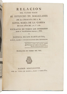[CORDOBA, Antonio de (1740-1811)]. -- [VARGAS y PONCE, Jos de (1760-1821)]. Relacion del Ultimo viage al estrecho de Magallanes de la fragata de S.M. Santa Marma de la Cabeza en los anos de 1785 y 1786. Extracto de todos los anteriores desde su descubrimiento impresosnoticia de los habitantes, suelo, clima y producciones del estrecho. Madrid: Por La Viuda de Ibarra, Hijos y Comanma, 1788. -- Apendice a la relacion del viage al Magallanes... Madrid: En La Imprenta de la Viuda de D. Joaquin Ibarra, 1793.
