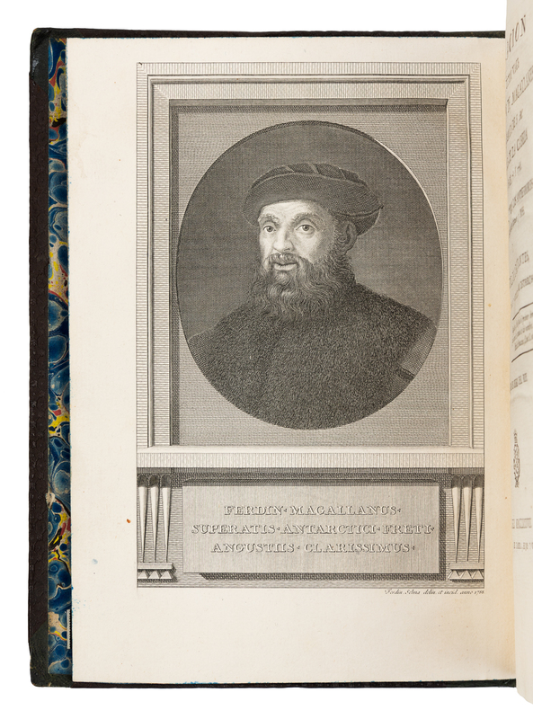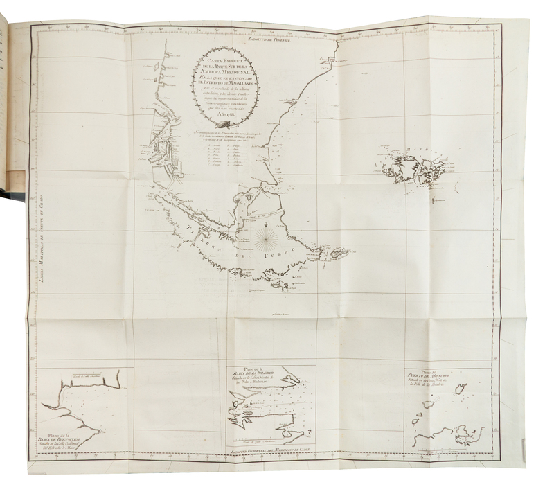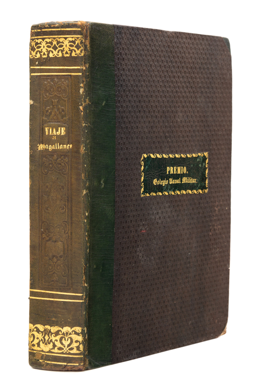 2 volumes bound in one, large 8vo (227 x 164 mm). Engraved frontispiece portrait of Magellan, 5 engraved folding maps and 5 folding tables. Mid-19th-century Spanish green half calf, spine gilt (extremities a little worn). Provenance: Colegio Naval Militar (prize label on upper cover, inscribed on verso of title-page). FIRST EDITION of the official Spanish documentation of the scientific voyage of the frigate St. Maria de la Cabeza to the Straits of Magellan, which set out to gather scientific and hydrographic information. The second half of the Relacion chronicles the historic voyages through the Straits, from Magellan to Drake to Bougainville. The maps are fine examples of rare 18th-century Spanish cartography, and two of the charts provide detailed delineations of the South American tip and Tierra del Fuego. Palau 352514 and 352515; Sabin 16765 (not including the "appendix").