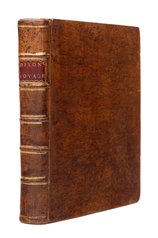 4to (262 x 199 mm). 5 engraved folding maps, 17 engraved plates (3 folding, 7 hand-colored). (A few plates with minor dampstaining, one or two with repairs on verso.) Contemporary tree calf gilt (joints skillfully restored).FIRST EDITION OF THIS ACCOUNT OF THE PACIFIC NORTHWEST, a voyage undertaken by the newly-formed King George's Sound Company to establish a fur trade between the northwest American coast and China. With Dixon as Captain of the Queen Charlotte and Nathaniel Portlock as captain of the King George, the expedition sailed to Prince William Sound where the two ships then parted. Dixon continued down the coast, discovered Queen Charlotte Island, Port Mulgrave, Norfolk Bay, and Dixon Archipelago, and made three stops in Hawaii for the purpose of trading and acquiring provisions. The ship subsequently stopped at Canton to trade and finally returned to Dover in September 1788. The text of Dixon's voyage is by William Beresford, the supercargo aboard the Queen Charlotte, written in the form of letters to a friend in London, but edited by Dixon who added the introduction, the appendix, and the maps. Cox II: 27-28; Forbes:161; Hill 117; Howes D-365; Lada-Mocarski 43; Sabin 20364; Streeter VI: 3484; Wickersham 6574.
