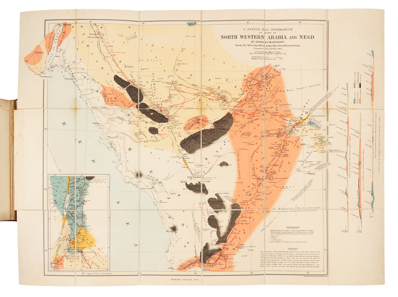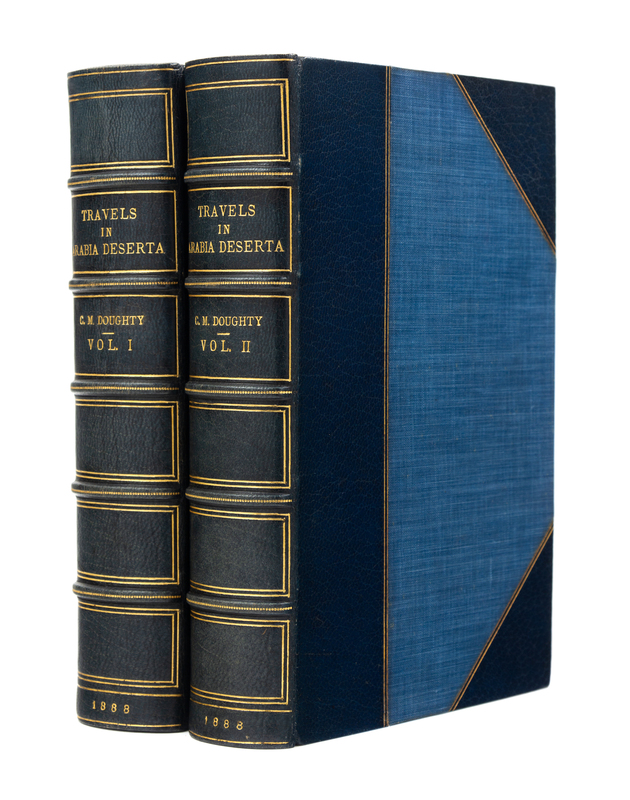 2 volumes, 8vo (222 x 142 mm). Color-printed folding map dissected and laid down on linen, 5 folding views or panoramas. (Some foxing mostly to preliminaries.) 20th-century half blue morocco git by Riviere (some spotting to foreedge). Provenance: Edward Joseph Dent (bookplate); Norman Douglas Simpson (bookplate). FIRST EDITION OF DOUGHTY'S GREAT CLASSIC ON ARABIA. "In its authenticity, originality, and power, Doughty's English-Arabic style rivals the work of other Victorian prose masters such as Carlyle, Ruskin, and Pater. Poet Robert Bridges quickly recognized Arabia Deserta's uniqueness, and it was one of William Morris's favourite books toward the end of his life" (ODNB). Bidwell, pp. 83-95.