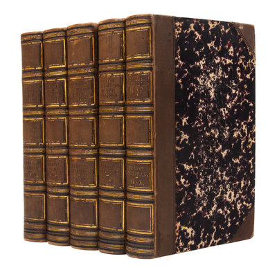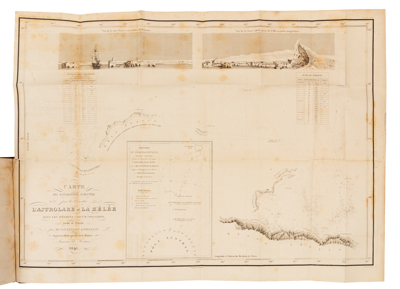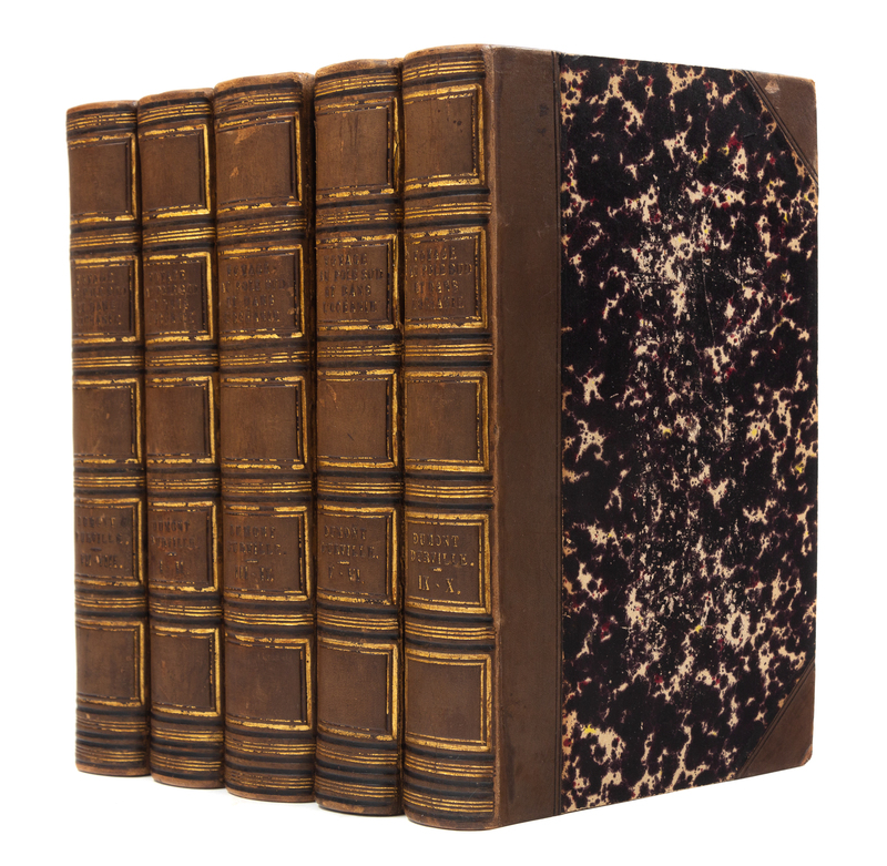 Text volumes only, 10 volumes bound in 5 (of 30, lacking 13 volumes 8vo scientific reports, and 4 volumes folio atlas), 8vo (207 x 143 mm). 9 engraved folding maps. (Scattered foxing.) Contemporary gilt-ruled half calf (lightly rubbed).FIRST EDITION of the first 10 volumes of this important exploratory expedition to the Pacific and southern Polar region. The work was issued over thirteen years, from 1841[2]-1855 and is seldom found complete. These first 10 volumes comprise the official textual record of the voyage and were those published during Dumont d'Urville's lifetime. After his accidental death in 1842, the work was continued and supplemented under the supervision of M. Dumoulin, who added sections on anthropology, botany, geology, hydrography, zoology and physics. The expedition reached the ice pack in January 1838 but failed to penetrate it. Returning eastward, the ships visited South Orkney and South Shetland Islands, discovered Joinville Island and Louis Philippe Land and proceeded to Valparaiso and Juan Fernndez Island. They then sailed to Mangareva, the Marquesas, Tahiti, Samoa, Tonga, Fiji, Guam, Palau and they circumnavigated Borneo. In 1840, from Tasmania, they returned to the Antarctic region where Adelie Land was discovered and an extensive visit to New Zealand was made. No complete edition was published in English until 1987-88. Ferguson 3184; Hill 508 (treating these first ten volumes as a distinct work); Rosove 105; Spence 399.