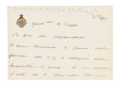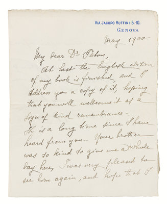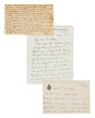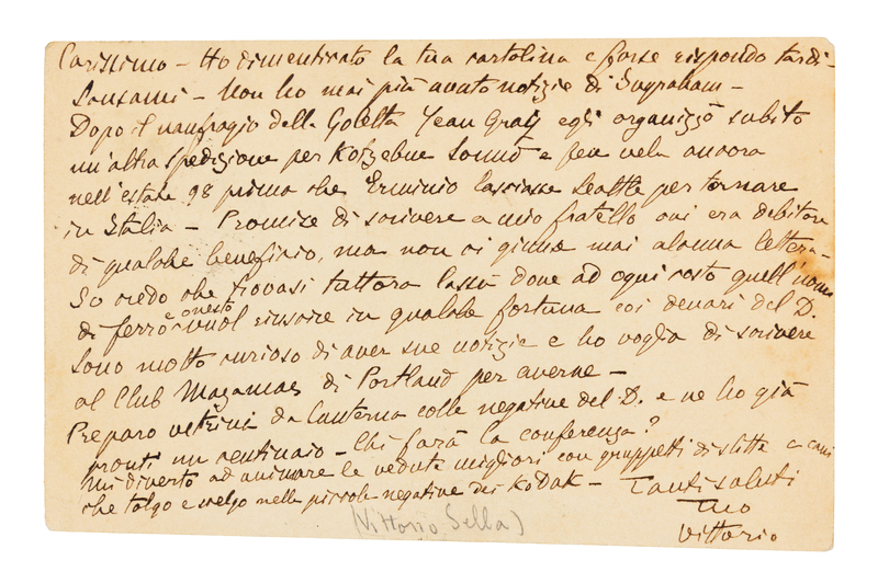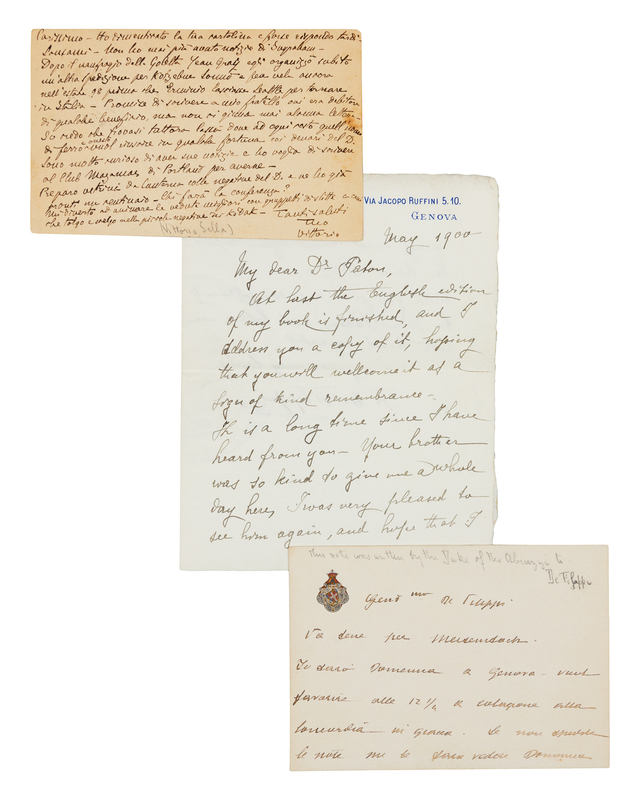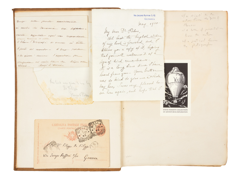 4to (285 x 190 mm). 34 photogravure plates, 4 folding panoramas, 2 color-printed folding maps, numerous half-tone illustrations in text. Publisher's tan cloth, original spine label, original cloth ties (text block and spine cracked down center with backstrip reinforced, printed label rubbed, ties frayed). Provenance: Stewart Paton (1865-1942), American psychiatrist (presentation inscription from Filippi). FIRST EDITION, LIMITED ISSUE, one of 100 copies on hand-made paper. PRESENTATION COPY, with an autograph letter signed from the author to Stewart Paton presenting this copy "as a sign of kind remembrance", May 1900, 1 page, 8vo. Also with an autograph note in Italian to the author from Luigi di Amedeo on personal note card, undated; and a postcard in Italian from the photographer Vittoria Sella to the author, postmarked Biella, Novara, 1 February 1900. See Neate F24; Perret 1655.