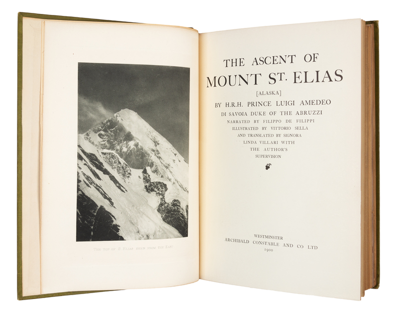 4to (268 x 187 mm). 34 photogravure plates, 4 folding panoramas, 2 color-printed folding maps, numerous half-tone illustrations in text. Publisher's green gilt-lettered cloth (spine ends with a few minor breaks).FIRST ENGLISH EDITION of the successful first ascent of the 18,000-foot peak on the Alaska-Canadian border by the great Italian Alpinist. Most of the photographic illustrations were by the great mountain photographer, Vittoria Sella. First published in Italian the same year. AN UNUSUALLY SOUND COPY, as most copies of this edition are found rebound or rebacked (or with contents shaken loose) due to the fragile nature of the gutta percha used in the original binding. Neate F24; Perret 1655.