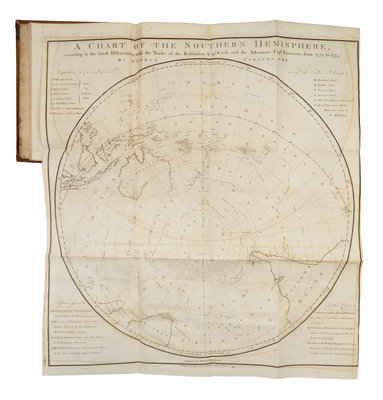 2 volumes, 4to (279 x 220 mm). Engraved folding map; errata. (Slight spotting, minor offsetting to map). 19th-century calf (rebacked in sheep). Provenance: Unidentified armorial bookplate (with motto "Ne vile Velis / Nemo me impune lacessit"); St. Augustine's College Library (bookplate). FIRST EDITION OF THE FIRST PUBLISHED ACCOUNT OF COOK'S SECOND VOYAGE. "An important and necessary addition to Cook's voyages" (Hill). The author and his father, Johann Reinhold Forster, sailed as naturalists on the Resolution. During this second voyage Cook made the first crossing of the Antarctic Circle, discovered the South Sandwich Islands and dispelled the idea of a great southern continent. Although originally it was intended that the elder Forster would write the official account of the voyage, a dispute with the Admiralty arose over payment and this unofficial account written by father and son was issued in March 1777 under the son's name, some six weeks before Cook's official account of the voyage. "For all the controversy A Voyage round the World is an interesting and important account that complements the official one with facts and astute observations on the human side of the voyage" (Rosove). Beddie 1248; Hill 625; Kroepelien 450; Rosove 132; Sabin 25134.
