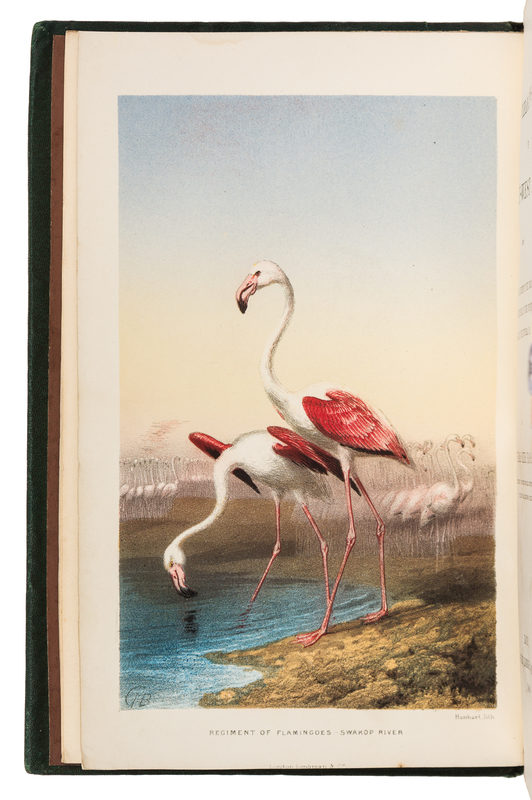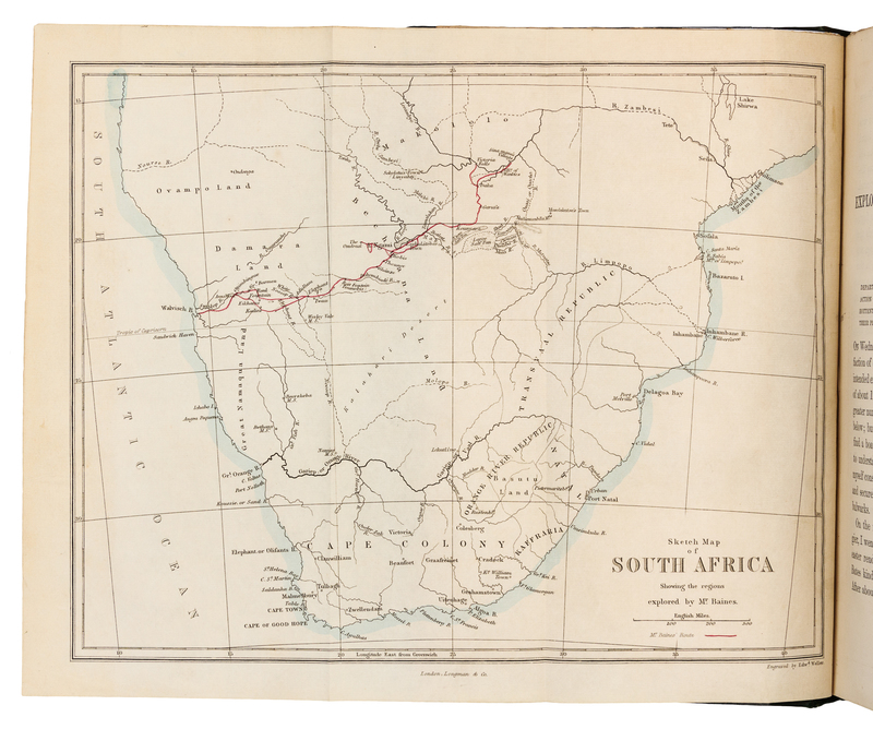 8vo (203 x 137 mm). Chromolithographed frontispiece, 3 folding engraved maps outlined in color, 8 wood-engraved plates. Publisher's blind-stamped green cloth gilt (head of spine expertly repaired).FIRST EDITION. Baines first travelled in Africa 1845 and from 1847-51 was artist to the British army expedition to the Cape. In 1855 he was appointed artist to the British expedition to N. W. Australia and returned to Africa in 1857 to joint Livingstone's note entirely successful Zambezi expedition. On this 1861 expedition he was accompanied by the ivory trader James Chapman and together they refined Livingstone's explorations, pioneering a route across the Kalahari to the Victoria Falls from Bechuanaland and Lake Ngami, and establishing a new trade route with the Zambezi. It was on this expedition that he completed his now famous paintings and views of the Falls -- all of which are reproduced in this work -- the first by a European artist. Czech, p. 9.