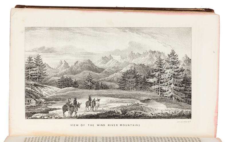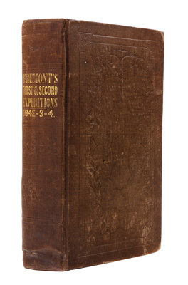 8vo (229 x 132 mm). Lithographed folding map in rear pocket (stained at fold with old repairs), 4 lithographed maps, 23 lithographed plates. Publisher's blind-stamped brown cloth (lacking front flyleaf, recased with repairs to spine ends and joints).FIRST EDITION, the Senate issue, with the astronomical and meteorological observations omitted from the House issue and subsequent editions. The two reports, written with the help of Fremont's wife Jessie Benton, "caught the public imagination: images of Fremont's guide, the then little-known Christopher 'Kit' Carson, riding bareback across the prairie, and Fremont himself, raising a flag on a Rocky Mountain peak, entered the national mythology" (Pamela Herr, American National Biography). The reports mapped out all California rivers south of the American River and the three Colorado rivers. They became essential guides for gold rush travelers and settlers heading for California and the Oregon Territory. Fremont stresses the importance of Preuss's large map of the routes traversed in both expeditions: "it fills up the vast geographical chasm" between Missouri and the Columbia River. Historians ever since have warmly agreed, calling it "monumental in its breadth--a classic of exploring literature" (Goetzmann, Exploration and Empire, p.248). Wheat deems it "as important a step forward from the earlier western maps...as...Pike, Long, and Lewis and Clark in their day" (Transmississippi, p.495). Cohen Mapping the West pp.130-133; Field 565; Graff 1436; Howes F-370; Sabin 25845; Streeter VI:3131; Wagner-Camp 115:1.