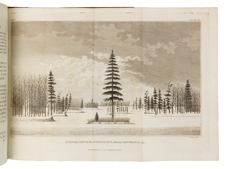 4to (272 x 212 mm). 5 engraved folding maps (one hand-colored in outline), 4 engraved folding plates. (Minor foxing to margins.) Contemporary calf gilt, edges gilt (rebacked preserving original backstrip, slight staining to covers).FIRST EDITION of Hearne's description of his discoveries on behalf of the Hudson's Bay Company. Hearne was the first European to travel overland to the Arctic Ocean, investigating potential copper mines North of Churchill. Appointed governor of Prince of Wales's Fort in 1775, Hearne was forced to surrender to La Perouse in 1782 and return to England. La Perouse saved Hearne's manuscript and returned it to the British for publication. Arctic Bibliography 95998; Hill 791; Sabin 31181 (incorrect plate count); Streeter sale 3652; TPL 445.
