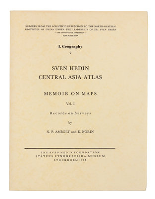 5 volumes, 4to. Numerous maps, plates, figures and tables (a few color-printed, many folding). Publisher's printed tan wrappers; Vol. II in original cloth.FIRST EDITIONS. Comprising volumes 1-5 in the Geography section of the Reports from the Scientific Expedition to the North-Western Provinces of China under the Leadership of Dr. Sven Hedin, publications nos. 47-50 and 54. In 1938 Hedin proposed to Dr. Justus Perthes at Gotha, the construction and publication of a map of Central Asia to the scale of 1:1,000,000 according to the rules outlined by the Commission of the International Map of the World of the 10th International Geographical Congress of 1913. All cartographical material available from Central Asia and Tibet was to be used. Work was begun in Gotha in 1939, but the war and the collapse of Germany in 1945 ended it. The project was restarted after the war when the Army Map Service, Washington, D.C., offered to "realize the project in a modified form." The scope of the atlas was to be reduced to comprise mainly Central Asia proper and the northern parts of the Tibetan highland north of lat. 32 deg. N. Although the idea for the atlas was conceived by Hedin, the work was carried out principally by Norin, who died in 1982, having practically completed his task. Yakushi (1994) H206.