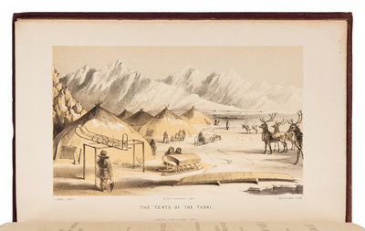 8vo (220 x 140 mm). 5 tinted lithographic plates, 2 maps (one folding). Publisher's maroon cloth gilt (spine and head of upper cover sunned slightly).FIRST EDITION of Hooker's endearing narrative of the HMS Plover's Franklin Search Expedition of 1848-1851. Hooper's health was irreversibly weakened by three Arctic winters and he wrote this narrative to relieve his own boredom while bedridden in London. He described befriending Chukchi children and one of the text illustrations is his own portrait: "a specimen of Tuski drawing, being in fact my Likeness, drawn by Enoch, the Canny lad. Like most portraits, it is too flattering" (p. 211). A VERY FINE COPY. Arctic Bibliography 7395; Lada-Mocarski 140; Sabin 32883; TPL 3176; Tourville 2177; Wickersham 6591.