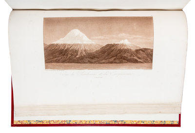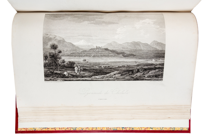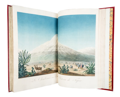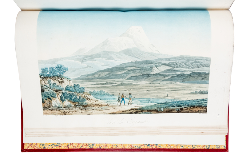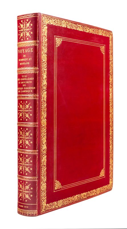 Folio (519 x 336 mm). HALF-TITLES, DESCRIPTIVE TEXT AND FIRST LEAF OF NOTES PRINTED ENTIRELY ON VELLUM. 69 engraved, etched and aquatint plates printed on Papier Velin, mostly engraved by Bouquet in Paris or by Arnold in Berlin after sketches by Humboldt and drawings by Aguera, Koch, Marchais and others, on 68 sheets (nos. 8 and 9 on one sheet) including 25 hand-colored and one hand-colored double-page view of Chimborazo. Modern crimson straight-grain morocco gilt, by Aquarius.FIRST EDITION of the "most beautiful and generally interesting of Humboldt's works" (Sabin). A REMARKABLE AND UNIQUE UNRECORDED ISSUE WITH TEXT PRINTED ON VELLUM. The folio Vues des Cordillres, et monumens des peuples indignes de l'Amrique was published as the atlas volume to part one of Humboldt's monumental Voyages aux regiones Equinoxiale du Nouveau continent, fait en 1799 1804. It is the most magnificent result of their scientific mission to Mexico, Central America and Spanish South America, especially to the highlands of the Andes. The itinerary covered by the text and plates is their journey over the Cordillera, following the Andes from Columbia into Peru and Lima, and their archeological investigations in Central America and Mexico. The plates were engraved from Humboldt's drawings with the hand-coloring done under his supervision. They are amongst the finest on South America, especially the double-page hand-colored view of Chimborazo. It was on this volcanic peak that Bonpland and Humboldt set a world mountaineering altitude record with their ascent to over 6,000m. The present copy is unique with the descriptive text and first leaf of Notes and Index (pp. 1-308) printed entirely on vellum; the three half-titles printed on vellum with the imprint on versos of J. H. Stone. The part-title to "Planches" and the Notes and Index (pp. 309-350) and all the plates printed on Papier Velin. This unique copy printed on vellum was perhaps a trial for an unrealized deluxe vellum issue. The printing of the Notes and plates is the superior of the two states of the book listed by Brunet, being on Papier Velin with the plates lettered en grises. The present copy is the early issue, without the 16pp, introduction dated 1813, and early state of the text.OF THE UTMOST RARITY: this issue with the text on vellum is unrecorded, with no copy in the British Library or the Bibliothque nationale, and is unknown to bibliographers. Brunet III:373; Hill, p. 148; Palau 117013; Sabin 33754.