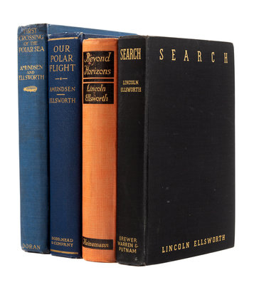 AMUNDSEN, Roald (1872-1928) and Lincoln ELLSWORTH (1880-1951). Our Polar Flight. The Amundsen-Ellsworth Polar Flight. New York: Dodd, Mead & Co., 1925. 8vo. Numerous illustrations. FIRST AMERICAN EDITION. -- AMUNDSEN, Roald and Lincoln ELLSWORTH. First Crossing of the Polar Sea. New York: George H. Doran, 1927. 8vo. Numerous photographic plates, folding route map. Provenance: Library label removed from front paste-down. FIRST ENGLISH EDITION. -- ELLSWORTH, Lincoln. Search. New York: Brewer, Warren & Putnam, 1932. 8vo. Numerous photographic plates, 3 maps. Publisher's black cloth gilt, top edge gilt. FIRST EDITION. -- ELLSWORTH, Lincoln. Beyond Horizons. London: William Heinemann, 1938. 8vo. Frontispiece, numerous half-tones, 2 maps. Provenance: Frederick I. Ordway, III (1927-2014) American space scientist and author (bookplate). FIRST BRITISH EDITION. -- All in original publisher's cloth, condition generally good.