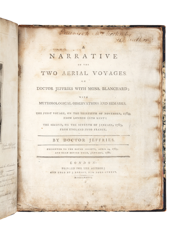 4to (264 x 215 mm). With engraved frontispiece, portrait and one engraved plate printed in brown. (Lacking half-title; frontispiece mounted repairing loss on lower margin and with imprint supplied in Ms.; engraved plate stained, trimmed and mounted; lower edges of most leaves frayed; leaves darkened at edges throughout from smoke or water damage.) Early 20th-century half roan (spine ends chipped). Provenance: Mrs. Morton (presentation inscription); Lord Kings Norton, Wooton Underwood (DATES) President of the Royal Aeronautical Society (bookplate).FIRST EDITION, PRESENTATION COPY, inscribed by the author on title-page: "Presented to Mrs. Morton by The Author." Jeffries was a wealthy American doctor from Boston residing in London and keenly interested in ballooning since having seen Count Zambeccari's ascents in 1783. Together with Jean-Pierre Blanchard, the failed challenger to the Mongolfier brothers, they made the first flight over the English Channel on January 7, 1785, from Dover to the coast of Calais. For this feat, and an earlier balloon flight in November 1784, Jeffries is considered the first American to fly.Brockett 6577; ESTC T10668. RARE: only one other inscribed copy has appeared at auction according to online databases.