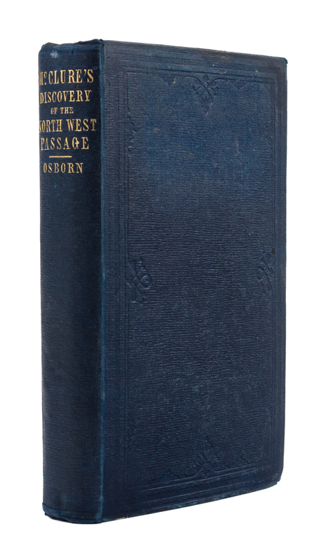 8vo. With hand-colored folding route map & 4 tinted lithographed plates. Original publisher's blind-embossed blue cloth (recased preserving original endpapers). FIRST EDITION, recounting McClure's discovery of a Northwest Passage. In 1850 McClure took command of the Investigator, one of two ships sent to find the British explorer Sir John Franklin, missing in the North American Arctic since 1845. McClure entered the Bering Strait from the Pacific and found two entrances to the Northwest Passage around Banks Island, now part of the Northwest Territories of Canada. The Investigator became trapped in the ice of Mercy Bay just north of Banks Island, compelling McClure to abandon the ship; his party was rescued by two ships at nearby Melville Island. The rescue ships were in turn abandoned and McClure then continued north and east to meet Belcher's ships which had come in from the east, thus completing a transit of the Northwest Passage. The primary aim of the expedition was the rescue of Sir John Franklin in which it failed. However after four years and eight months M'Clure succeeded in completing the first north-west passage, from Alaska to the Atlantic. Abbey Travel 647; Hill (2004) 1122; Lada-Mocarski 145; Sabin 43073.